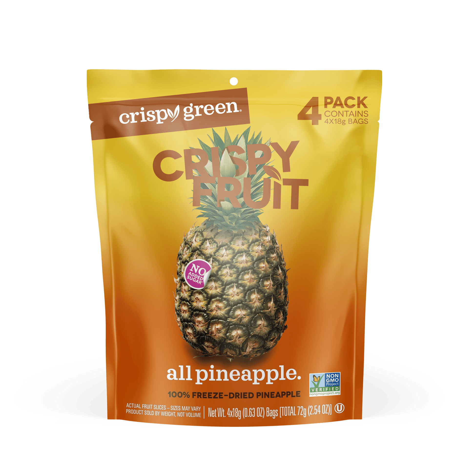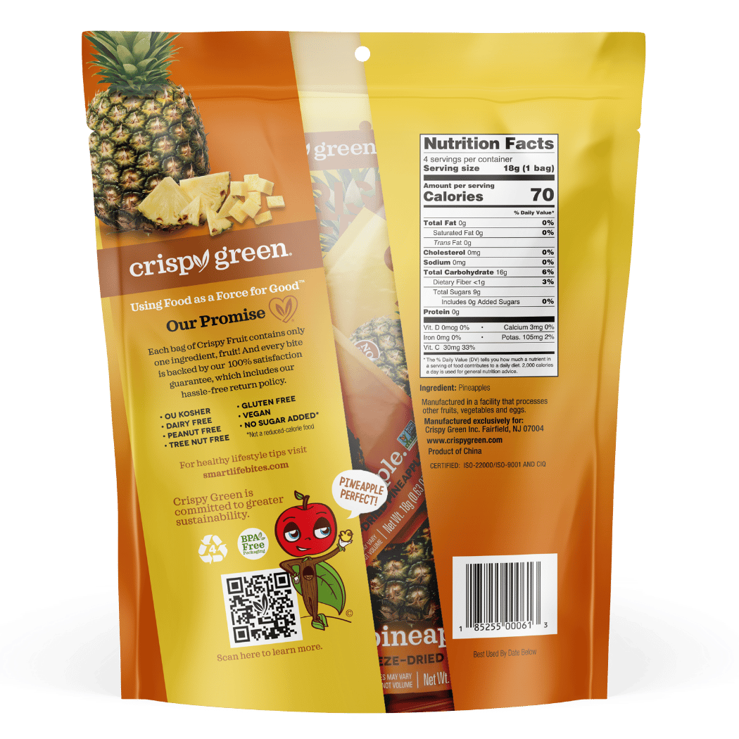 Crispy Fruit freeze-dried pineapple delivers the Feel Good Crunch busy families love. These naturally sweet, crispy fruit snacks make it easy to add more real fruit to your day—in a fun, convenient way. Perfect for school lunches, sports practice, or road trips, our multi-pack includes four individually wrapped snack-size bags that are ideal for sharing, saving, or enjoying anytime you need a better-for-you pick-me-up.